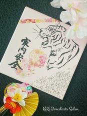 縁起の良い寅カッティング転写紙に加飾を施してある家内安全祈願タイルです